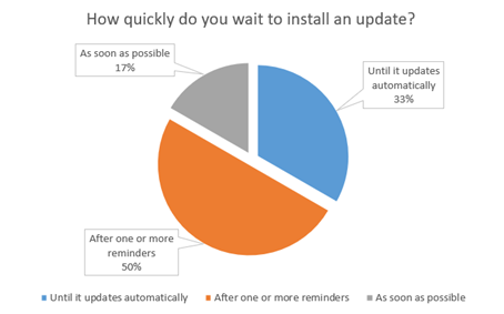 - Only 17% of participants updated software immediately when prompted; 50% waited for reminders and 33% left it until automatic updates kicked in