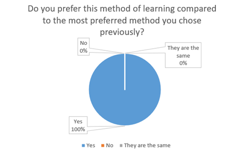 - 100% of participants said they preferred this method of learning over the method they had previously identified as their favourite, including reading, lectures, and videos
