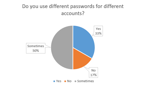 - Only around 33% of participants used completely different passwords across all their accounts, with 17% admitting to using the same password everywhere