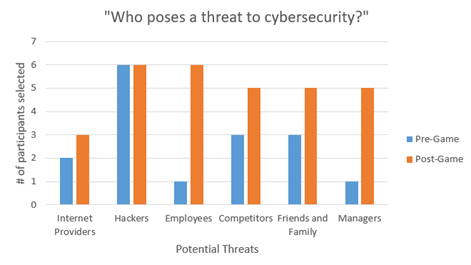 - Understanding of who poses a cybersecurity threat saw the most significant improvement of any survey question. Recognition of employees, managers, and trusted individuals as potential threats improved dramatically compared to pre-game responses