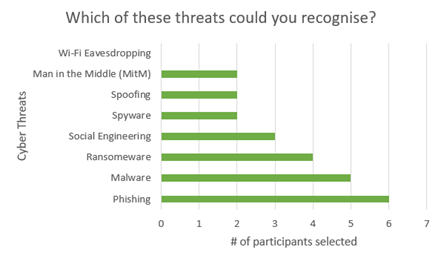 - Phishing was the most widely recognised threat, with malware and ransomware close behind, while network-based threats like Man-in-the-Middle and Wi-Fi eavesdropping were far less recognised