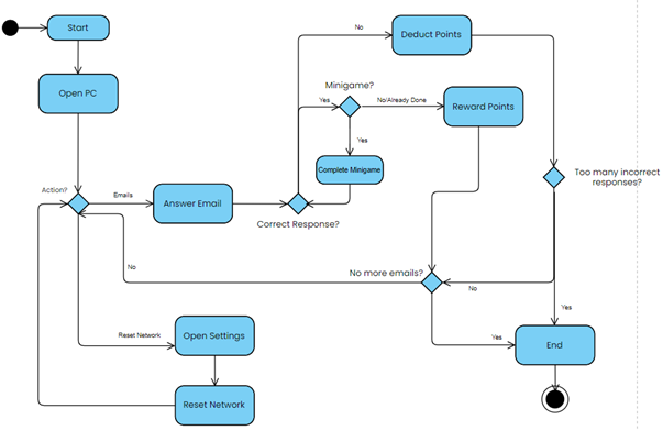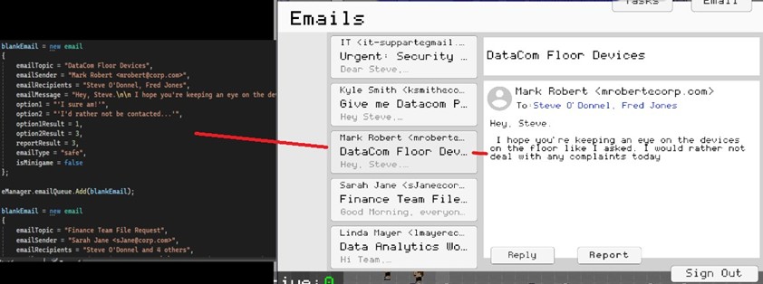 When the player responds to an email, the result value for the chosen option is passed to the scoreManager, which handles point allocation. Emails flagged as minigames open a secondary screen upon a correct reply. Compose-email types require the player to select the correct recipient and attachment before sending, with each field evaluated independently by the scoreManager.