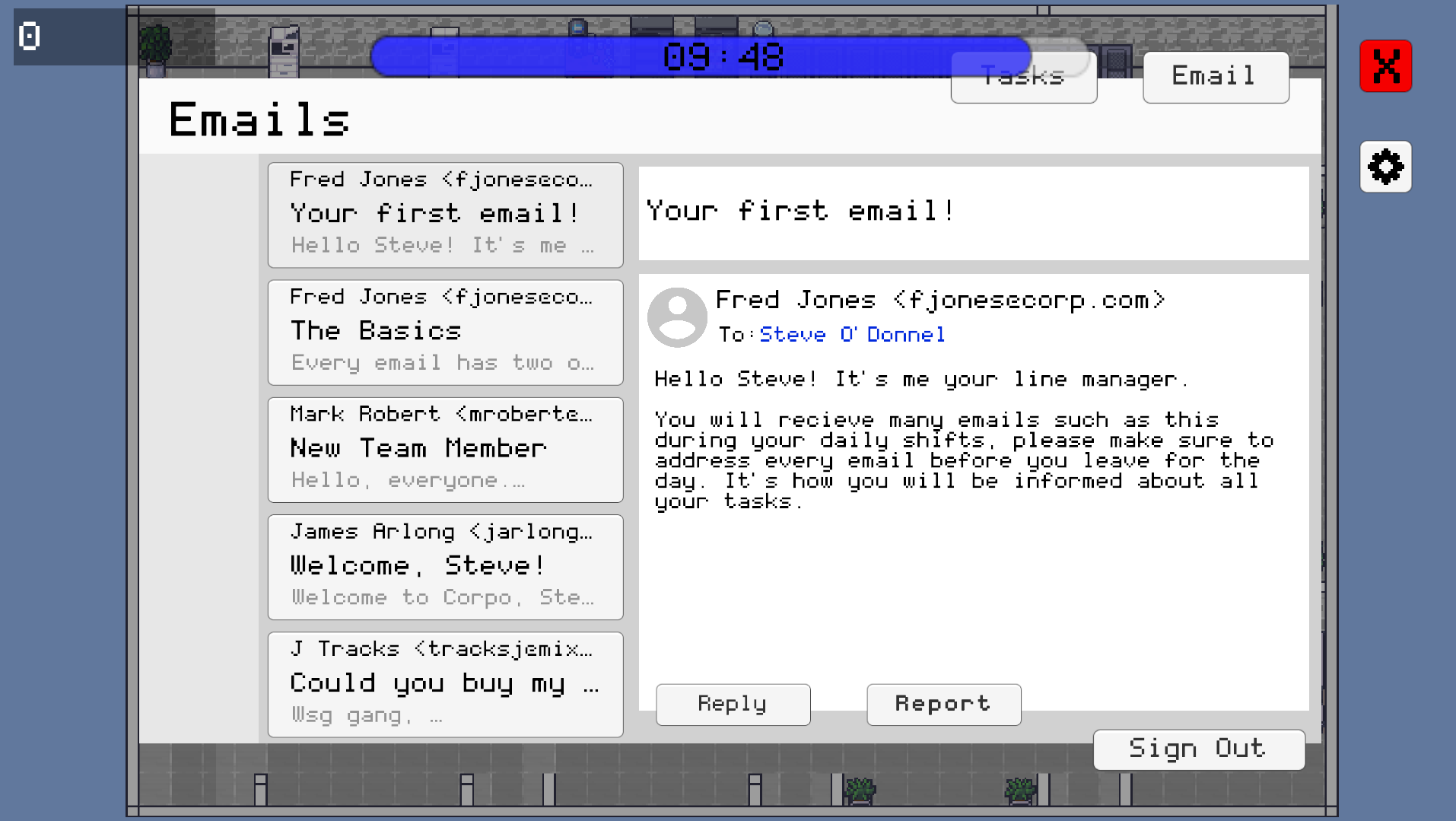 The email system is the core gameplay mechanic. Each level, the player receives a set number of emails that must be cleared from the inbox within the time limit. Emails are a mix of legitimate company correspondence and malicious ones, and the player must respond to each with one of two options: Reply or Report.