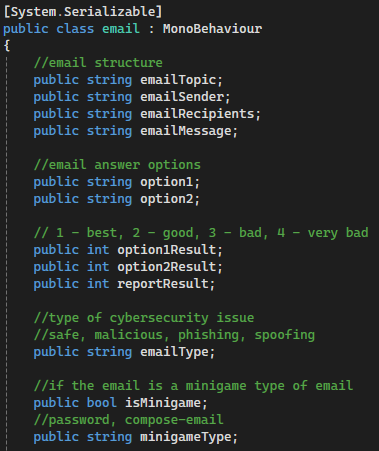 The email system is built around two classes: email and emailManager. The email class acts as a data container, storing everything needed to define and display a single email within the game. Each email object holds:
