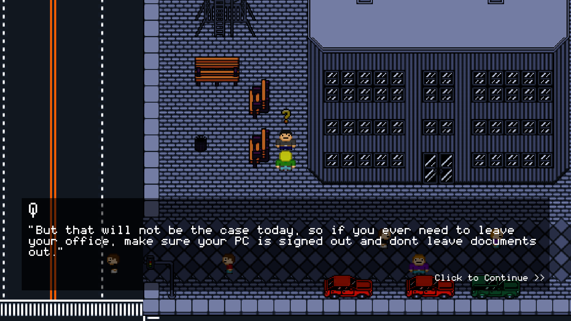 Four characters carry the narrative: Steve, the player character; Mark, the negligent manager whose behaviour enables a hostile work environment; Fred, Steve's line manager who introduces new mechanics and offers guidance; and Q, a mysterious figure outside the Corpo building who provides background on the threats Steve will face each day.