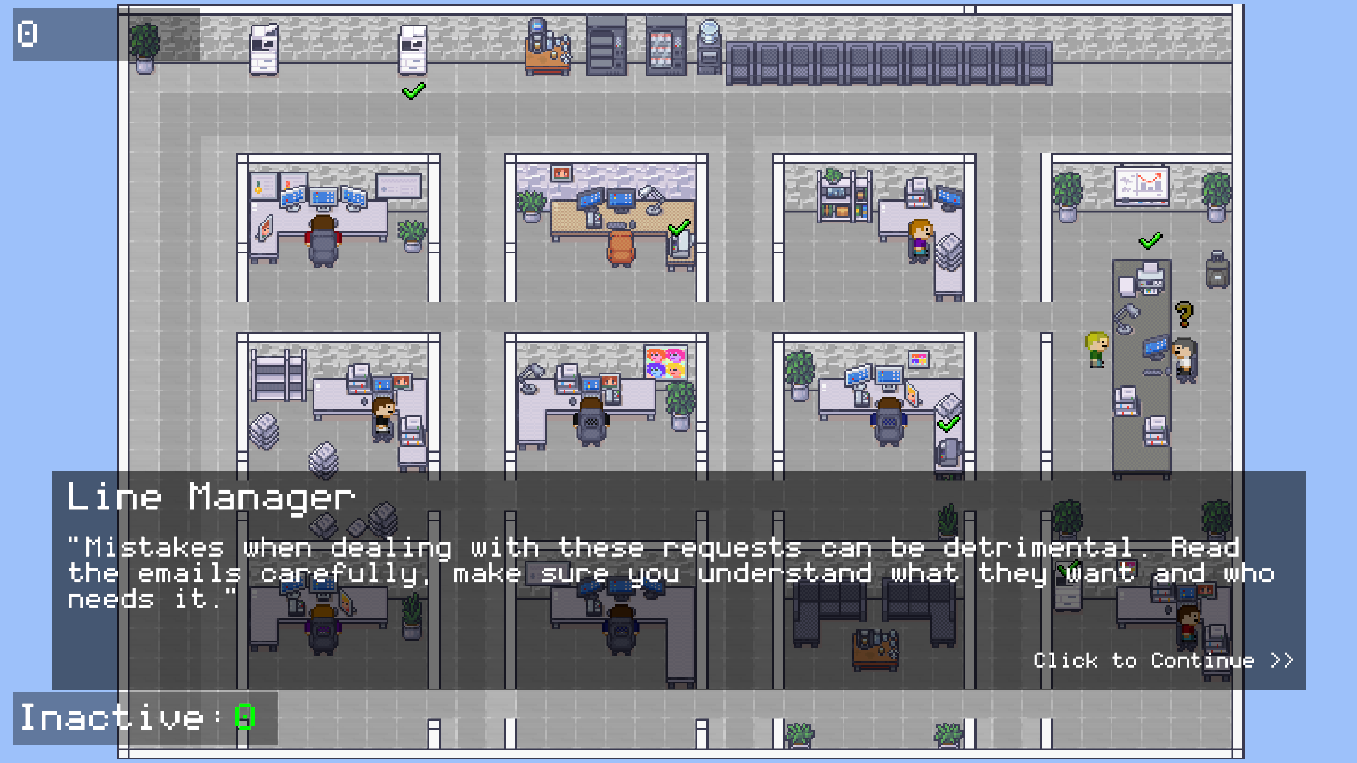 To create situations where the player must leave their desk, a machine maintenance minigame was implemented. Devices around the office break at random intervals, and leaving them broken for too long also results in a point deduction. This creates a recurring conflict between staying at the computer to manage emails and moving around the office to maintain equipment, while ensuring the screen remains locked when unattended.