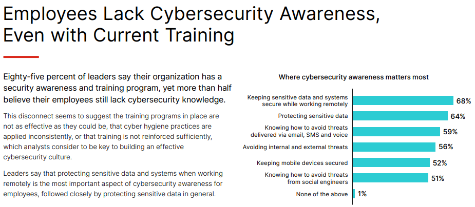 - 85% of organisations have a cybersecurity training program in place, yet almost 60% of business leaders believe their employees still lack cybersecurity awareness.