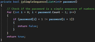isSimpleSequencemethod iterates through the list and returns true if every value increments by exactly 1, flagging predictable patterns as weak