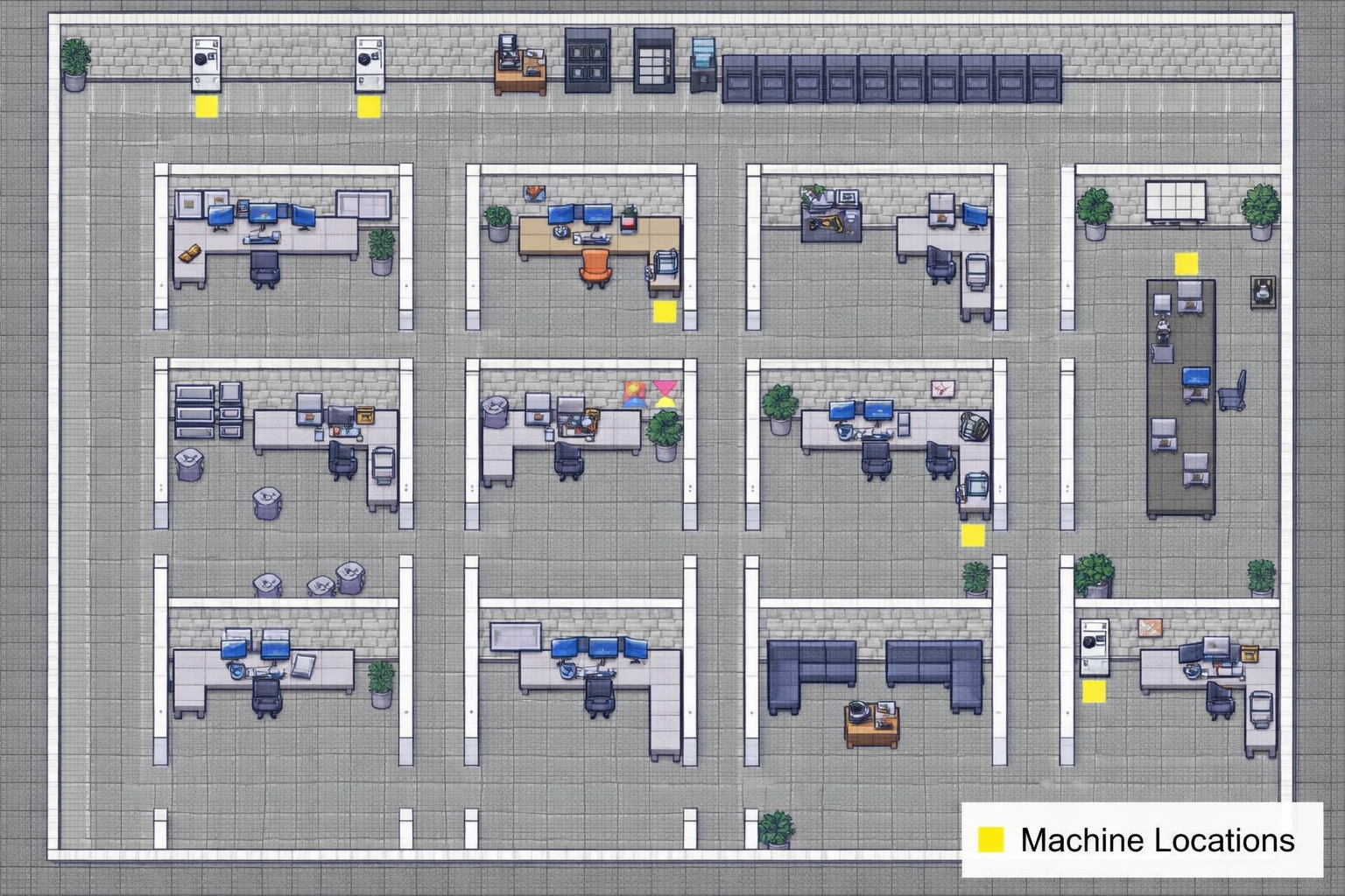 Office marked with machine locations that must be fixed if broken