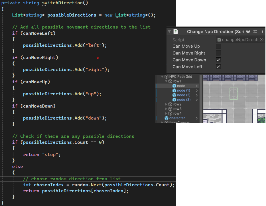 Office NPCs spawn at the start of each level and navigate the office using a network of nodes. When an NPC reaches a node, the node's switchDirection method evaluates which directions are enabled for that position and randomly selects one. If no directions are enabled, the NPC stops. This produces varied movement paths across the office without every route needing to be manually scripted.