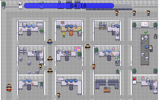 Insider threats and physical security risks were represented through the office environment. NPCs move around the office throughout each level following a grid-based movement system. If the player leaves their desk without logging out of their computer, there is a chance that a passing NPC will tamper with it, resulting in a point deduction. This mechanic directly represents the risk of leaving a device unlocked and unattended in a shared workspace.