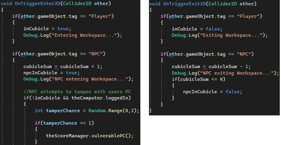 The security mechanic is handled by a trigger zone around the player's cubicle, managed by the playerOfficeCheck script. This zone tracks two things independently: whether the player is inside it, and whether any NPCs are inside it. If an NPC enters the zone while the player is absent and the computer is still logged in, Random.Range(0, 2) is called; a result of 1 triggers vulnerablePC() on the scoreManager, deducting points. The 50% chance reflects the unpredictable nature of insider threats rather than making the penalty feel automatic or unfair.