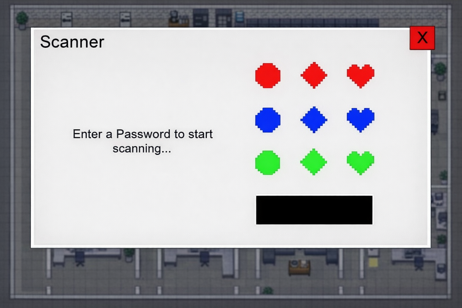 The passcode scanner is triggered by specific emails and requires the player to leave their desk and interact with a physical scanner object in the office. The player creates a passcode using a grid of coloured symbols (circles, diamonds, and hearts in red, blue, and green) to begin a document scan.