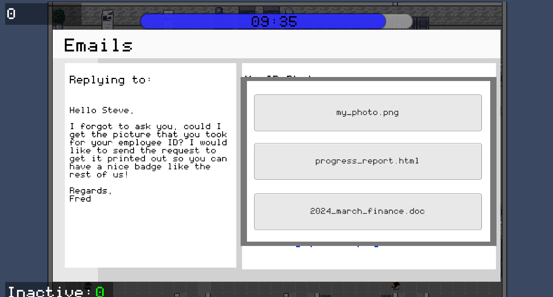 Certain emails trigger an additional compose-email minigame, where the player must select the correct recipient and attach the correct file before sending. Selecting either field incorrectly results in a point deduction, representing the real-world risk of misdirected sensitive information.