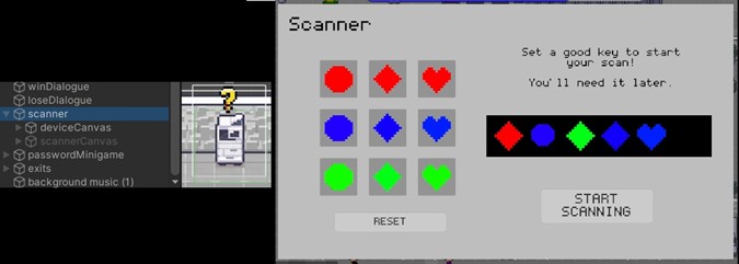 The player creates a passcode by selecting from a grid of nine coloured symbols — circles, diamonds, and hearts in red, blue, and green. Each symbol maps to an integer value from 1 to 9, and the entered passcode is stored as a list of integers. A switch statement in scannerController handles both adding each symbol's value to the list and placing the correct symbol graphic in the correct position on the UI.