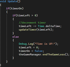 The countdownTimer script holds a timeLeft float that decrements every frame while timerOn is true. When timeLeft reaches zero, it calls endGameLoss() on the gameManager directly. During development, a unit test revealed that this call was missing; the timer was reaching zero and stopping without triggering the loss sequence. This was identified and resolved promptly.