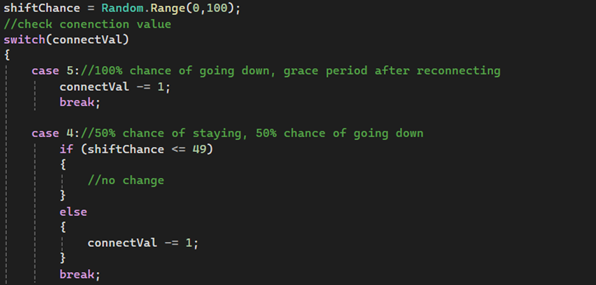 The Wi-Fi system runs on a separate connectionStatus script that manages a connectVal integer ranging from 5 to 0. At set intervals, wifiShift() is called, which uses Random.Range(0, 100) and a switch statement on the current connectVal to determine whether the connection goes up, stays the same, or goes down. The probability of degradation increases as connectVal decreases: at a value of 5 the connection always drops by one, while at higher values there is a chance it holds or recovers. At zero, the player is moved onto an unsecured network and the scoreManager begins applying a continuous point deduction until the connection is restored.